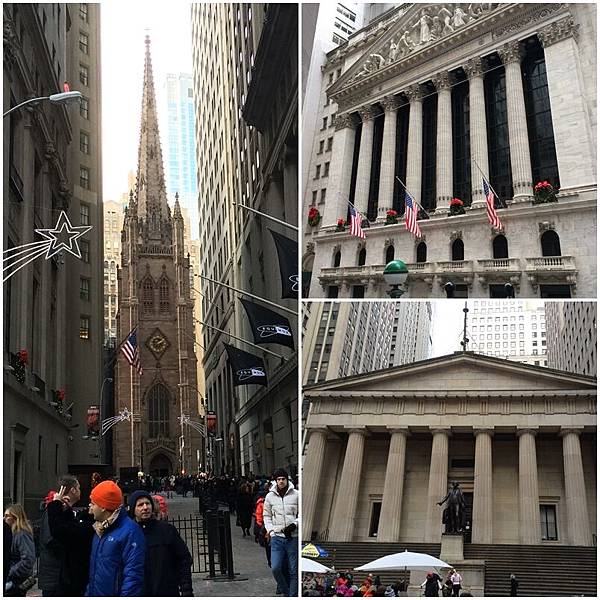 然後去看華爾街銅牛,Trinity church三一教堂(國家寶藏拍攝),沿著Wall street有紐約證卷交易所(插的旗子都標top of the world)、Federal Hall聯邦國家紀念堂,其實走一下就可以走到布魯克林大橋奔向布魯克林區啦,不過因為我們還要跨年,就回到world trade center
