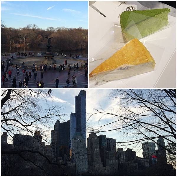走出博物館再度當紐約客漫步公園,在公園的長椅吃了貝果,冷冽的空氣下透過乾枯的枯枝看到的曼哈頓摩天大廈彷彿是模型般,果然是沉澱心靈的好地方。路過廣大的湖區到達中央的畢士達噴泉廣場 ,小孩在這吹著泡泡嬉戲著,洋溢悠閒的氣氛。走到底剛好是第五大道的The Plaza飯店,進去裡面吃了Lady M(幸虧排隊人潮沒有cupcake那麼多),抹茶和原味都好吃(2片 $16)